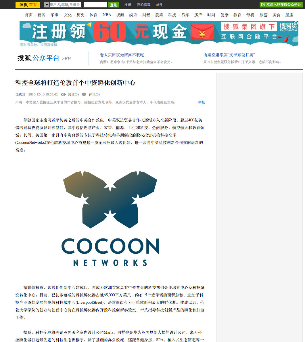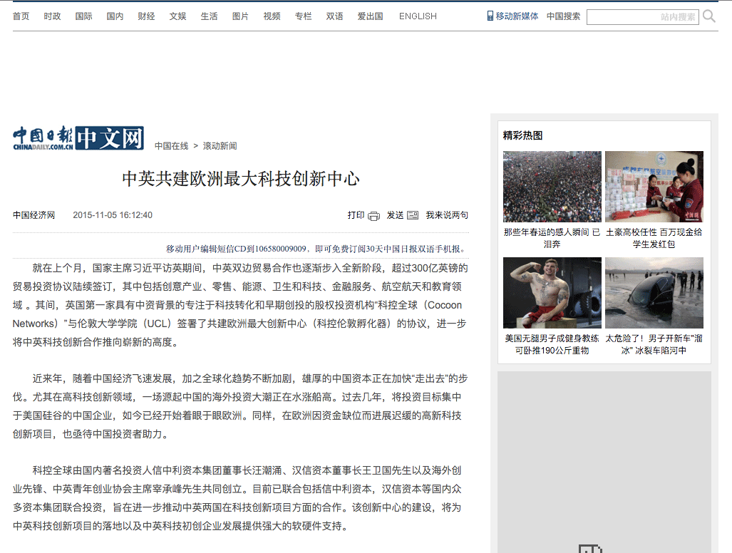 科控全球(Cocoon Networks)与伦敦大学学院签署了共建欧洲最大创新中心(科控伦敦孵化器)的协议,将为中英科技创新项目的落地以及中英科技初创企业发展提供强大的软硬件支持。